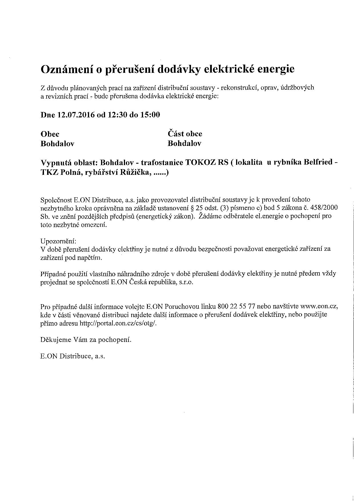 Společnost EG.D oznamuje přerušení dodávky elektrické energie v Bohdalově ve